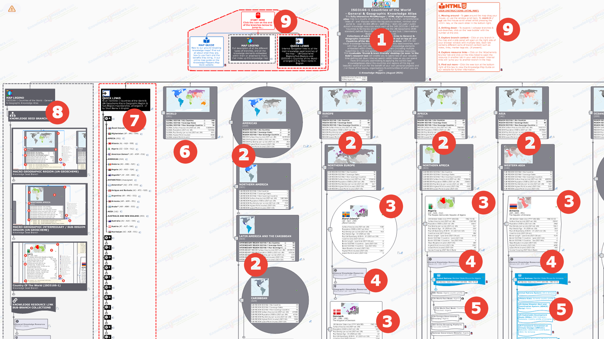 It builds on the knowledge framework provided by our ISO3166-1 Countries Of The World – Base Atlas through the addition of collections of knowledge resource links sub-branches ‘built out off of’ the country seed branch, each with a single hyperlink to official / definitive / plain old useful General or Geographic knowledge resources about it found in the public domian….