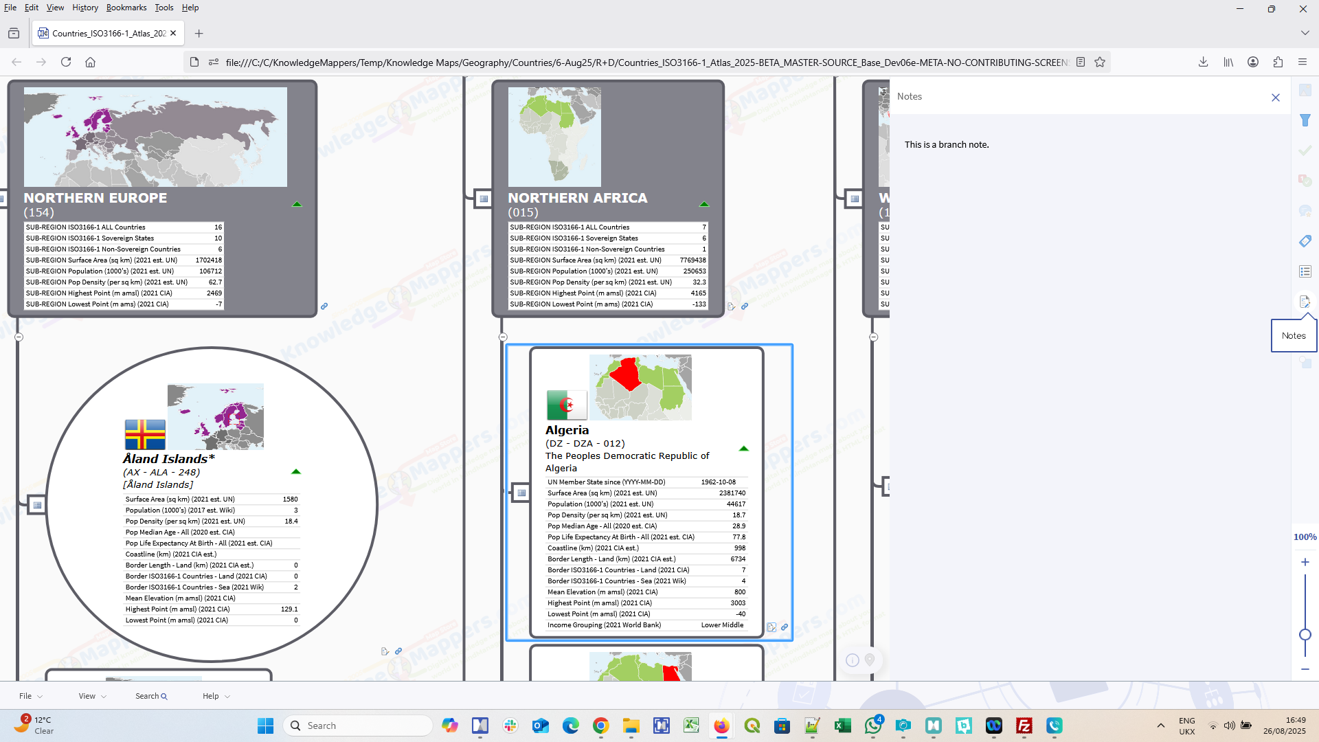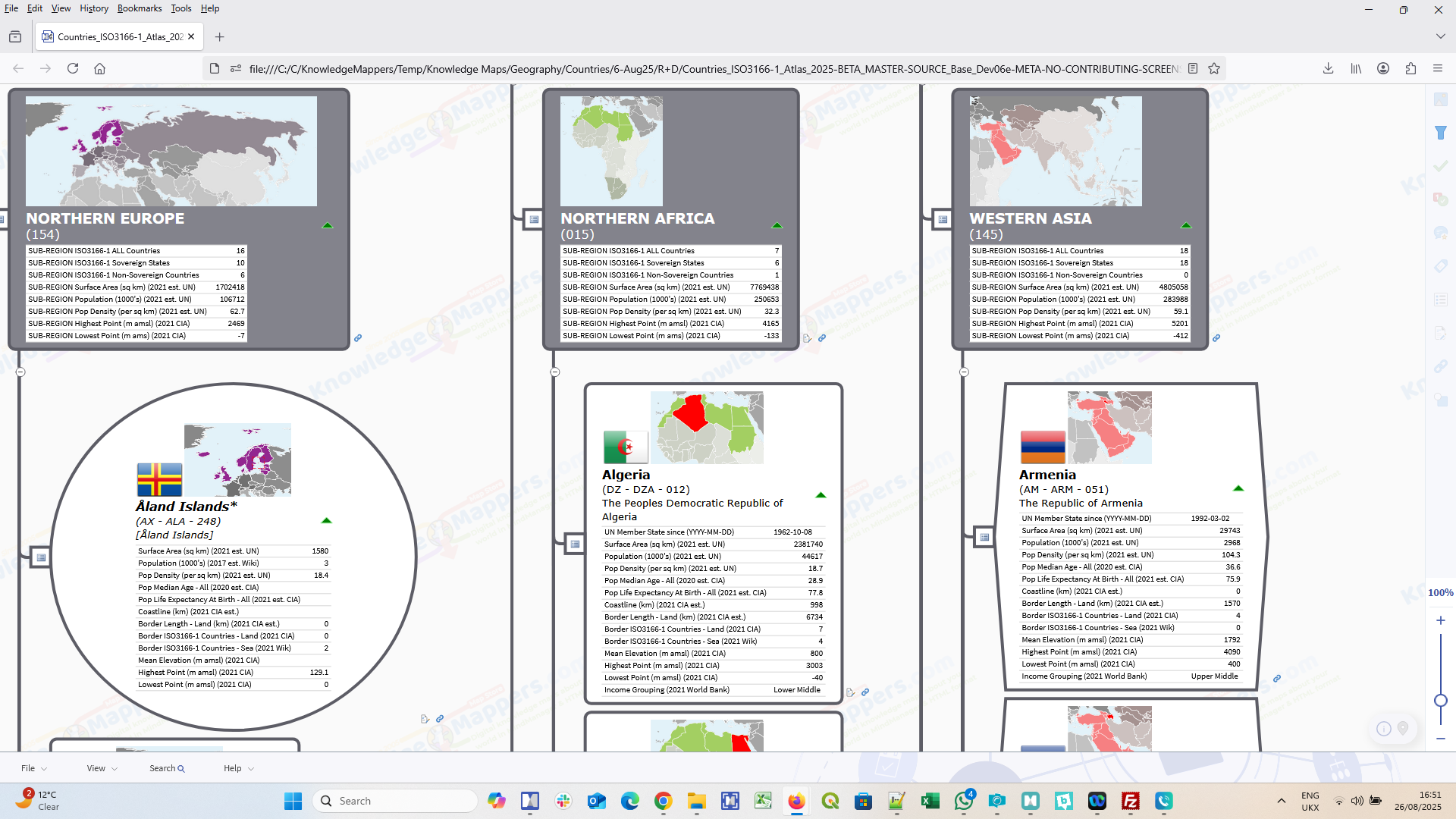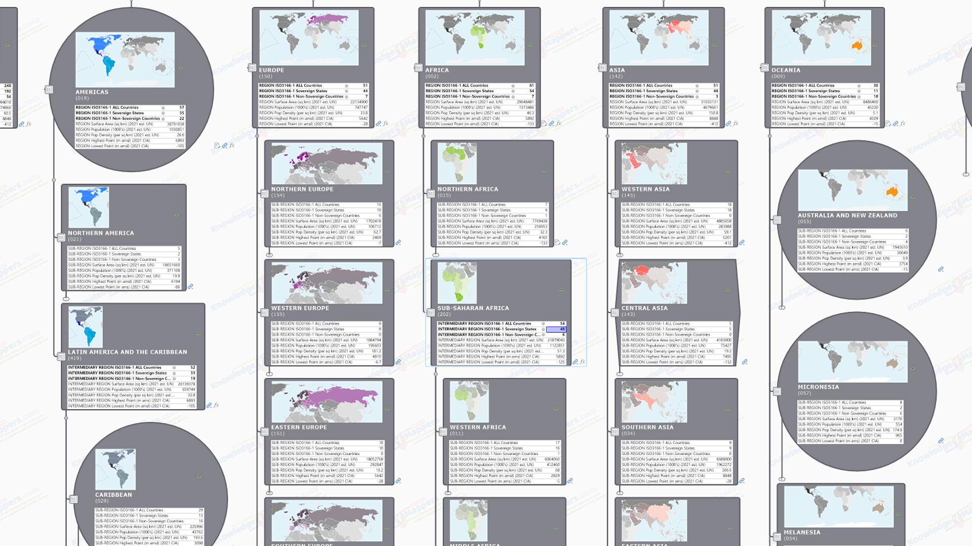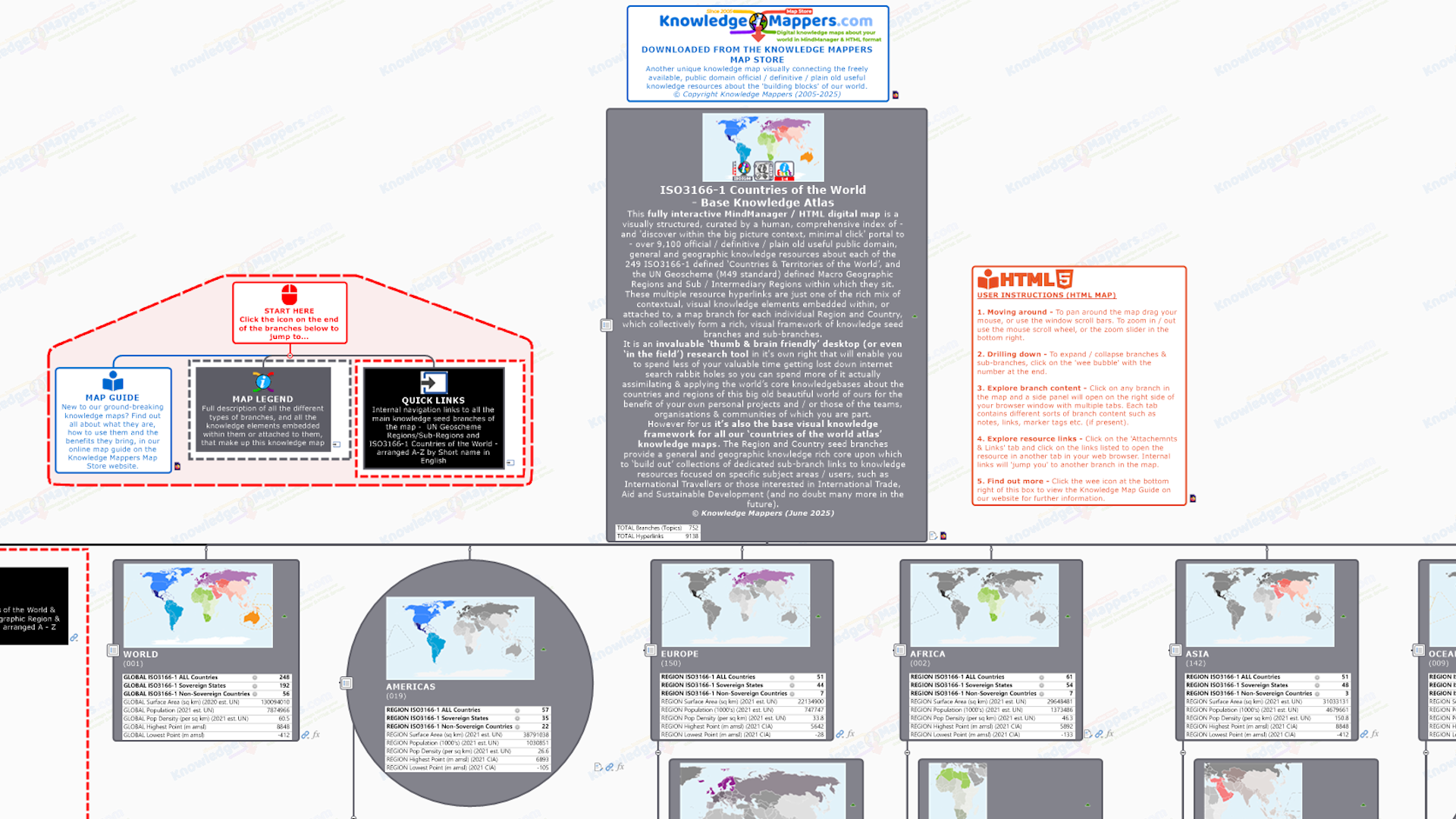 As well as defining the physical and logical layout of the map, the first 2 / 3 levels of branches are also ‘knowledge seed branches’ for each UN defined Macro Geographical (Continental) Regions, Intermediary Regions & Sub-Regions. They are visually rich, with a unique, embedded bespoke location map image, a