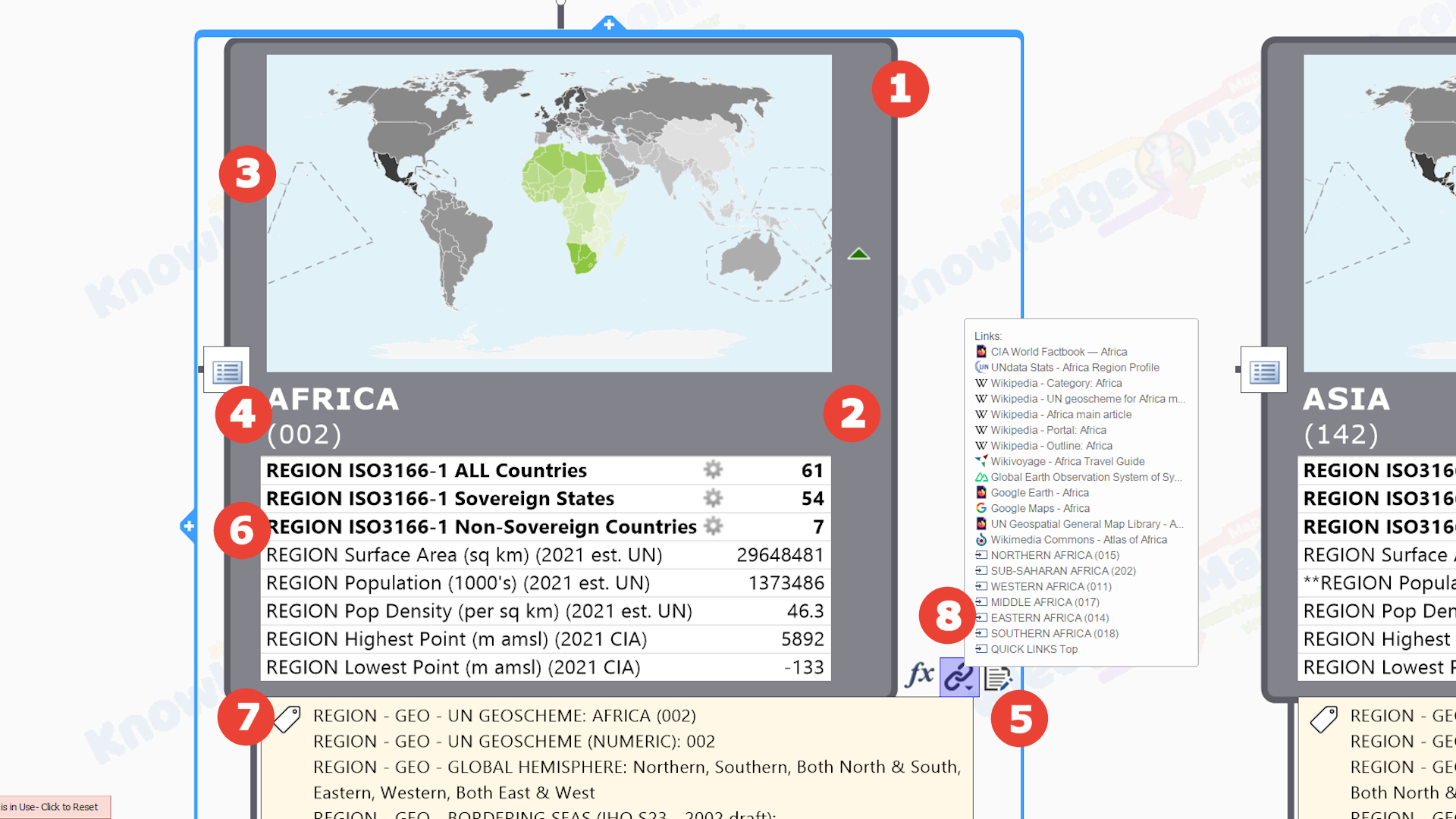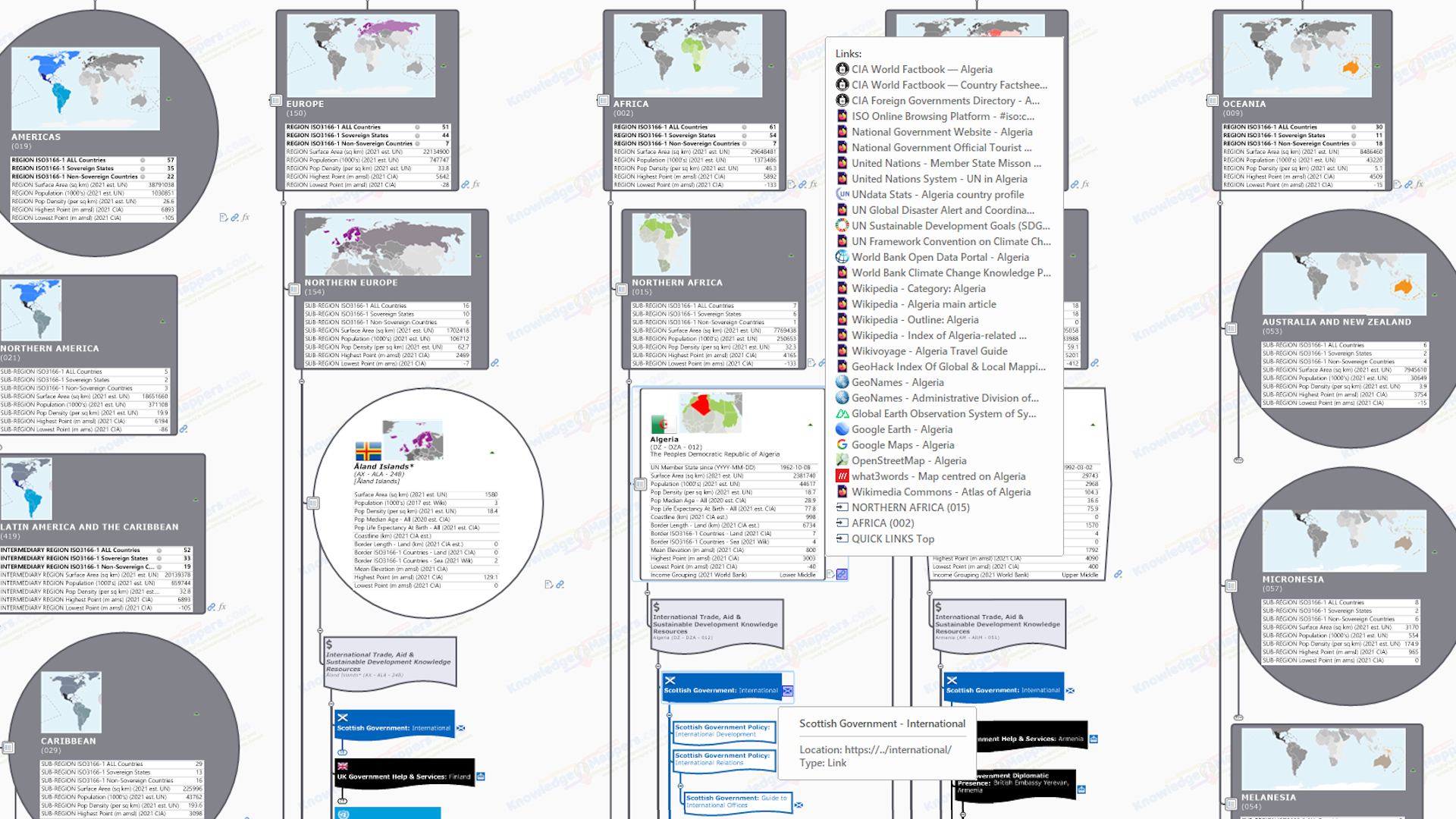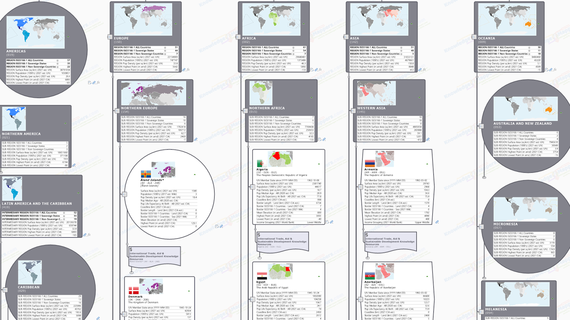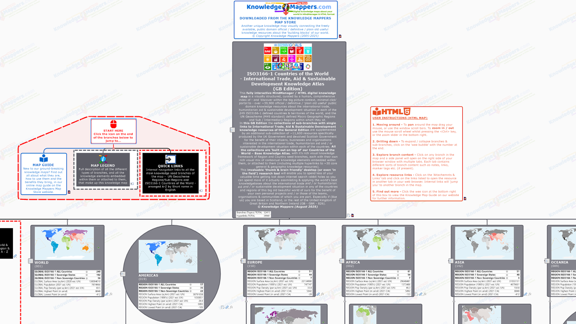 As well as defining the physical and logical layout of the map, the first 2 / 3 levels of branches are also ‘knowledge seed branches’ for each UN defined Macro Geographical (Continental) Regions, Intermediary Regions & Sub-Regions. They are visually rich, with a unique, embedded bespoke location map image, a