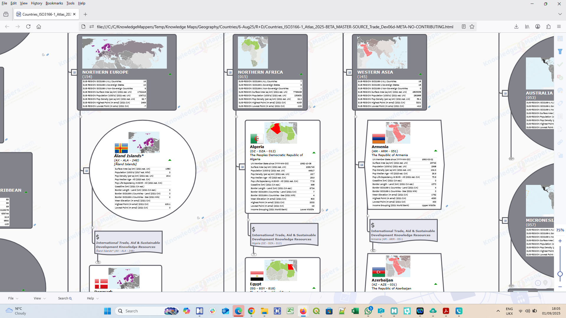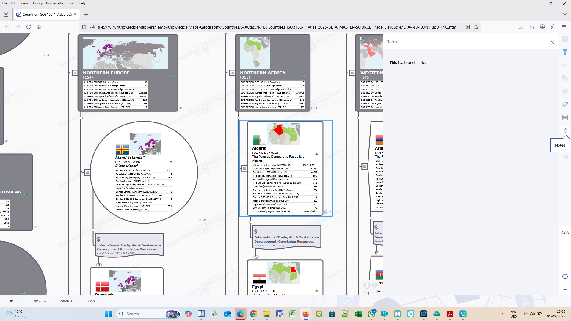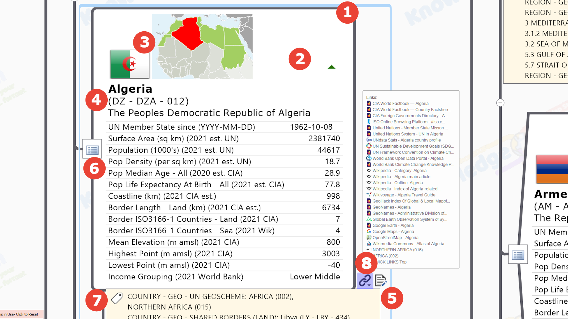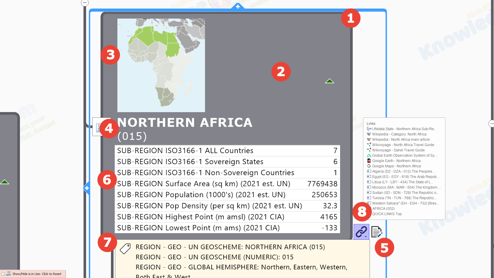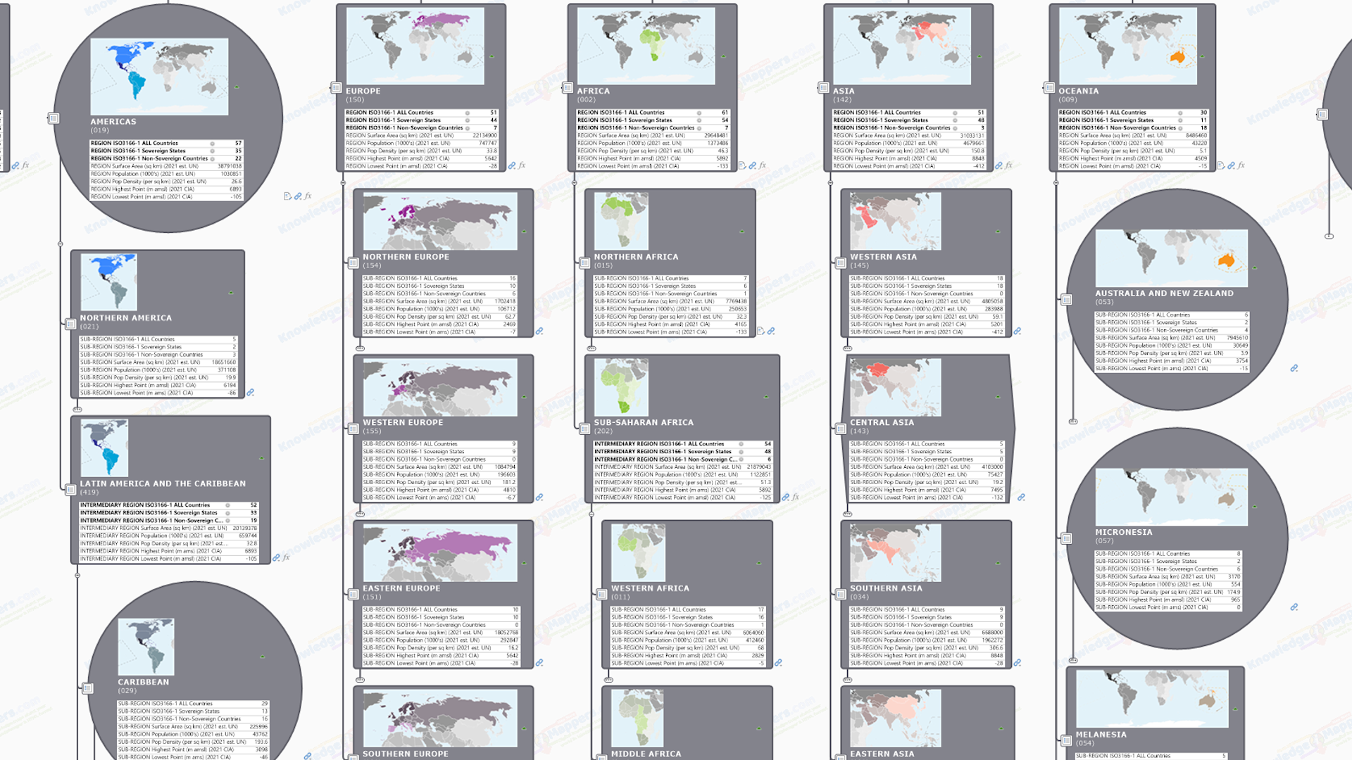 As well as defining the physical and logical layout of the map, the first 2 / 3 levels of branches are also ‘knowledge seed branches’ for each UN defined Macro Geographical (Continental) Regions, Intermediary Regions & Sub-Regions. They are visually rich, with a unique, embedded bespoke location map image, a
