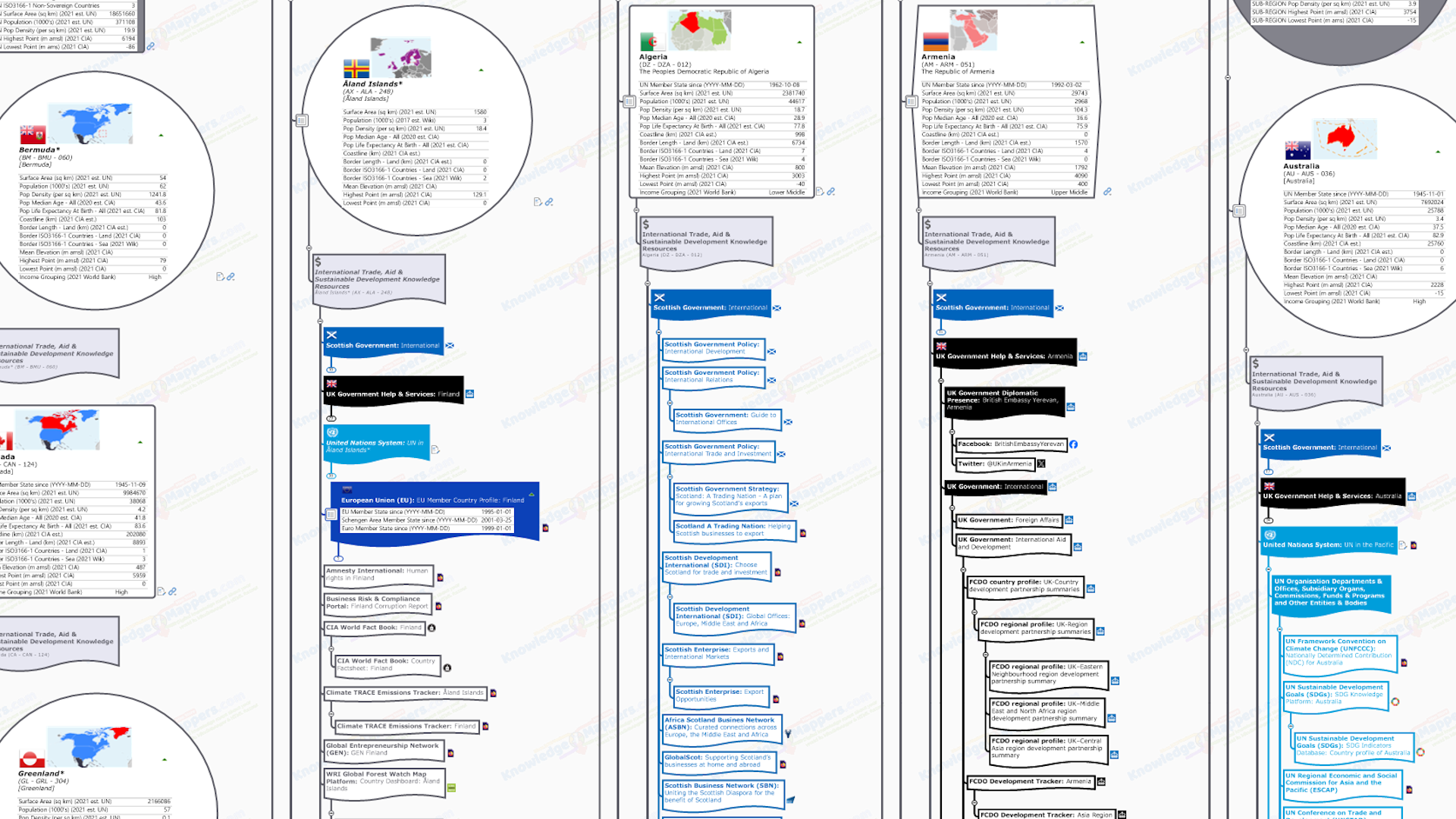 This fully interactive MindManger / HTML digital knowledge map is an invaluable ‘thumb & brain friendly’ desktop (or even ‘in the field’) research tool that will enable you to spend less of your valuable time getting lost down internet search rabbit holes so you can spend more of it actually assimilating & applying the world’s best knowledgebases about the international trade and / or humanitarian aid and / or sustainable development situation in any of the countries and regions of this big old beautiful world of ours for the benefit of your own personal projects and / or those of the teams, organisations & communities of which you are part. Especially if (like us) you are based in Scotland, or one of the other ‘home nations’ of the