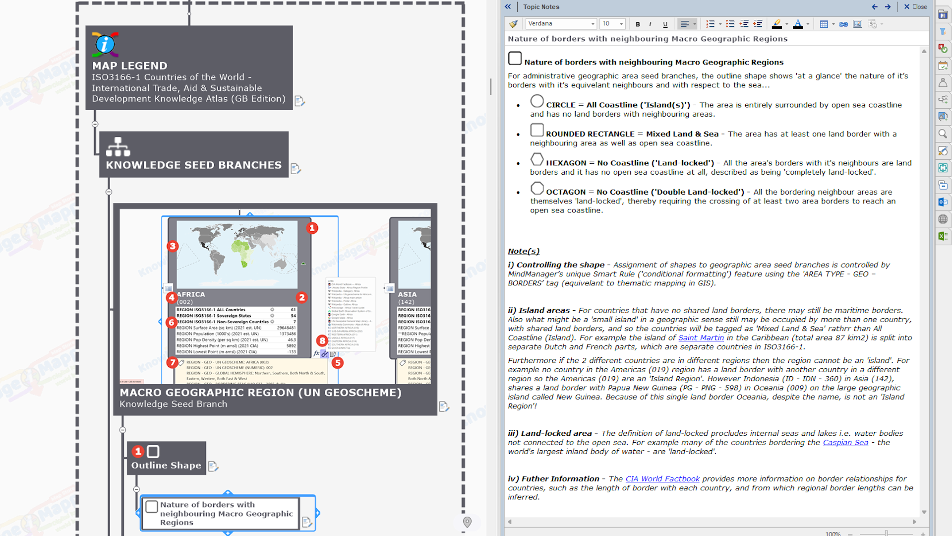 Both ‘Region’ and ‘Country’ seed branches have a rich range of contextual knowledge elements visibly embedded within them or attached to them (most of which are unique to MindManager)…