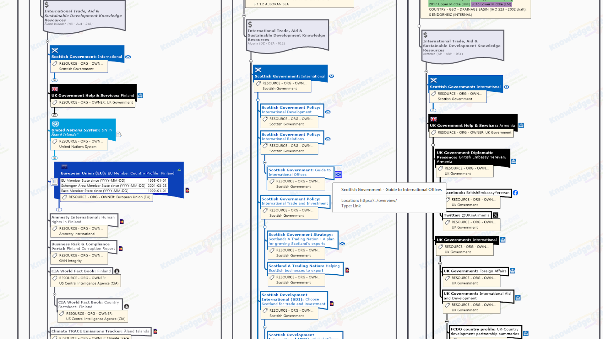 In this GB Edition the collections of sub-branches with single links to International Trade, Aid & Sustainable Development knowledge resources of the General Edition are supplemented by an additional collection of ~11,600 resources specifically produced by the UK Government and devolved Scottish Government for the benefit of their citizens, businesses and organisations interested in the international trade, humanitarian aid and / or sustainable development situation within each of the country. Both collections are ‘built out on top of’ our Countries of the World – Base Knowledge Atlas, with it’s rich visual knowledge framework of Region and Country seed branches, each with their own rich visual mix of contextual knowledge elements embedded within them, or attached to them (including multiple hyperlinks to ~30 core general & geographic knowledge resources).
