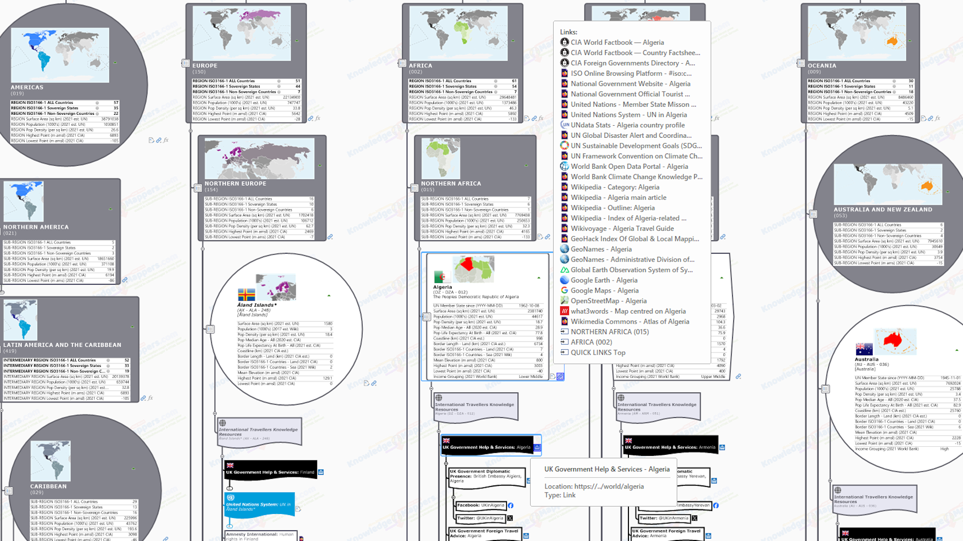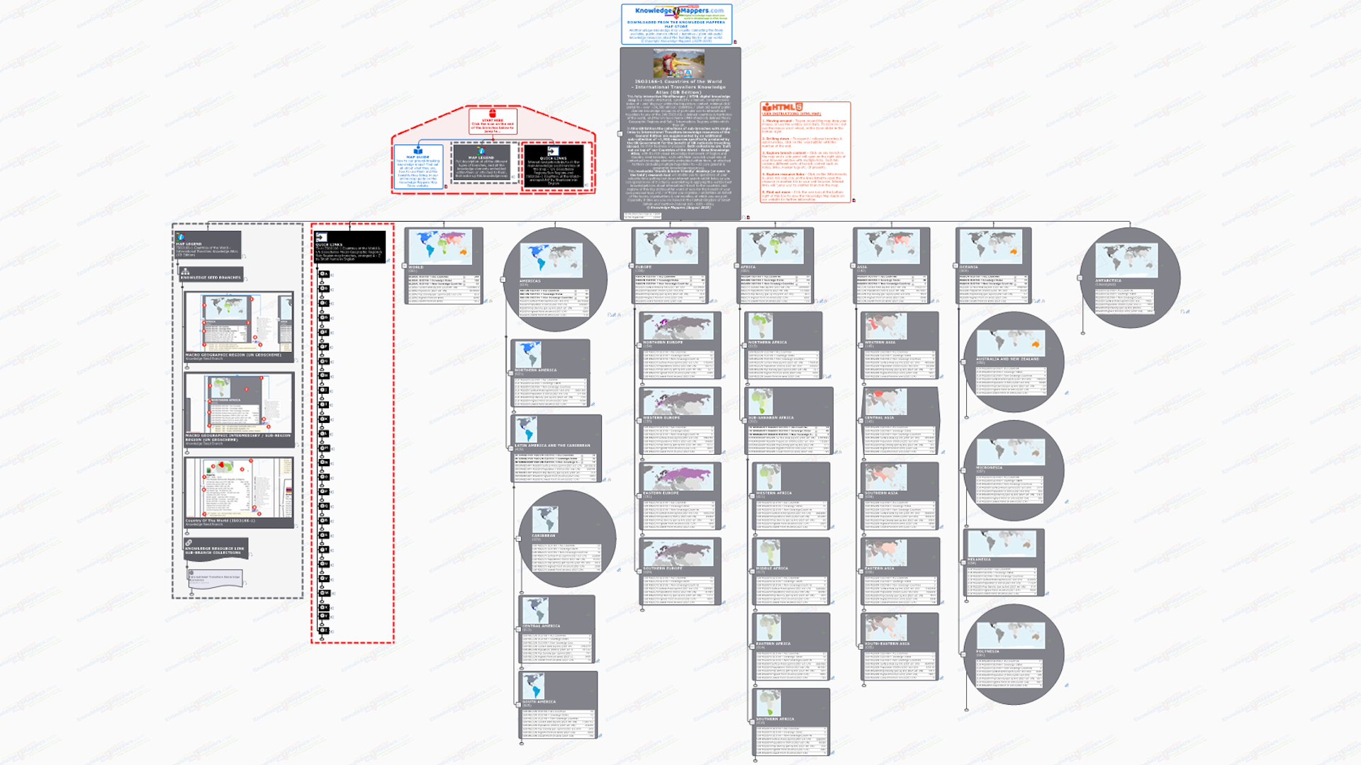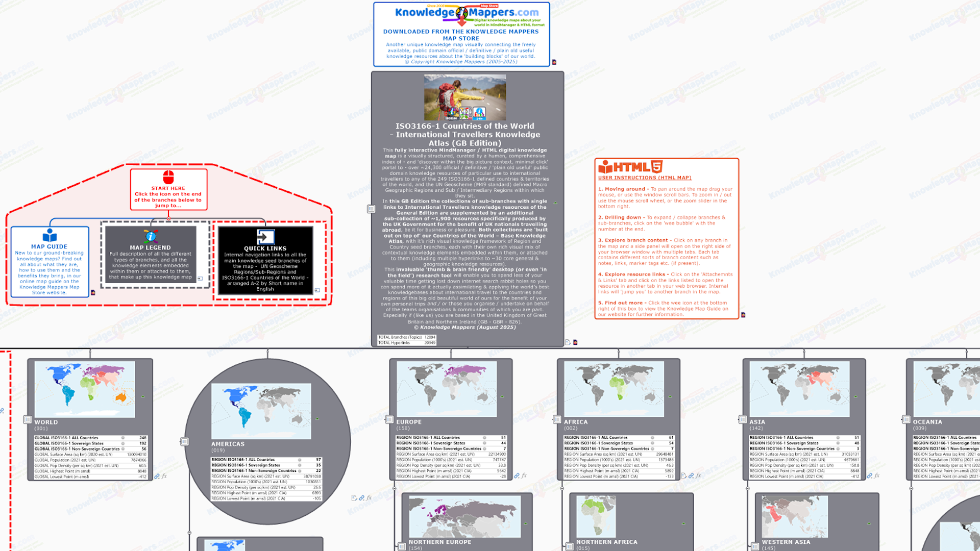 As well as defining the physical and logical layout of the map, the first 2 / 3 levels of branches are also ‘knowledge seed branches’ for each UN defined Macro Geographical (Continental) Regions, Intermediary Regions & Sub-Regions. They are visually rich, with a unique, embedded bespoke location map image, a