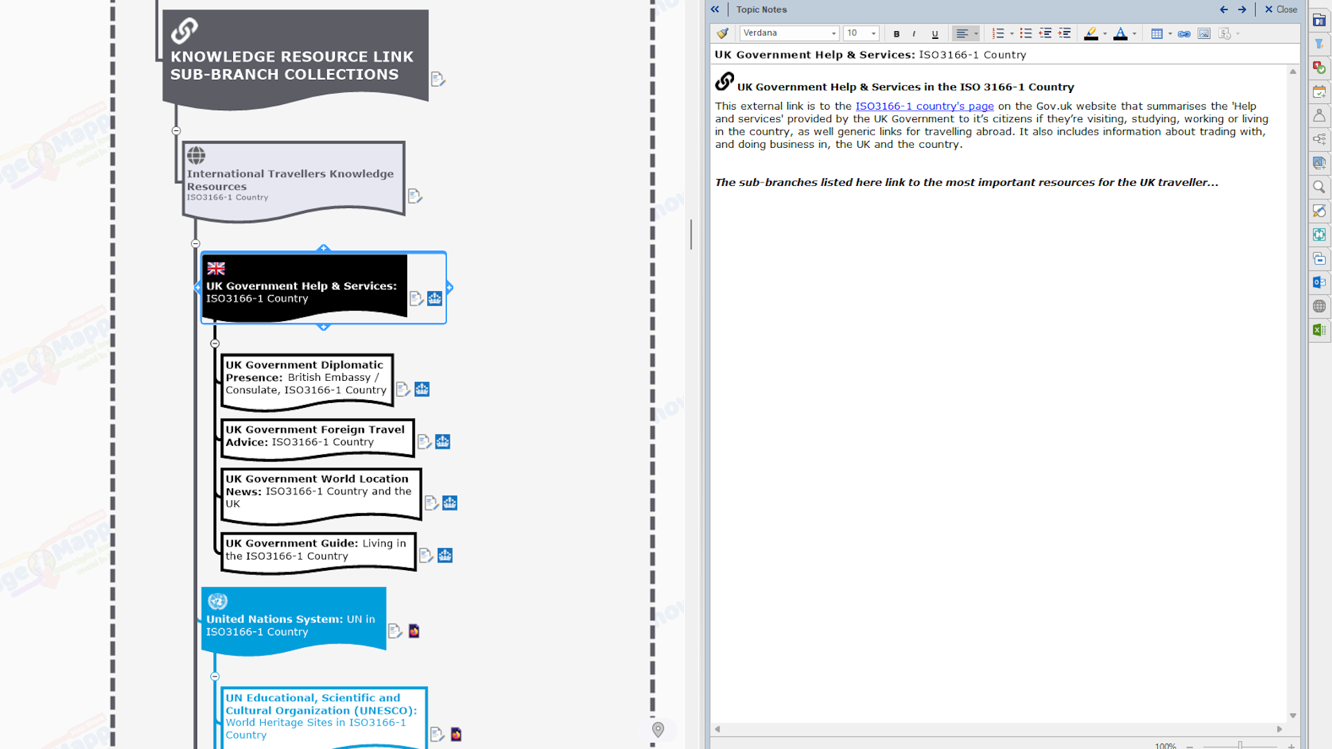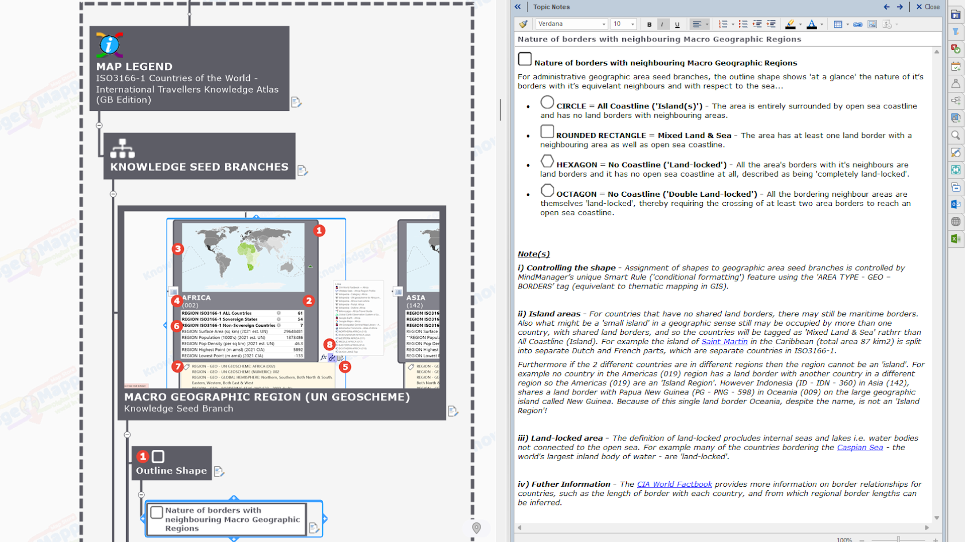 Both ‘Region’ and ‘Country’ seed branches have a rich range of contextual knowledge elements visibly embedded within them or attached to them (most of which are unique to MindManager)…